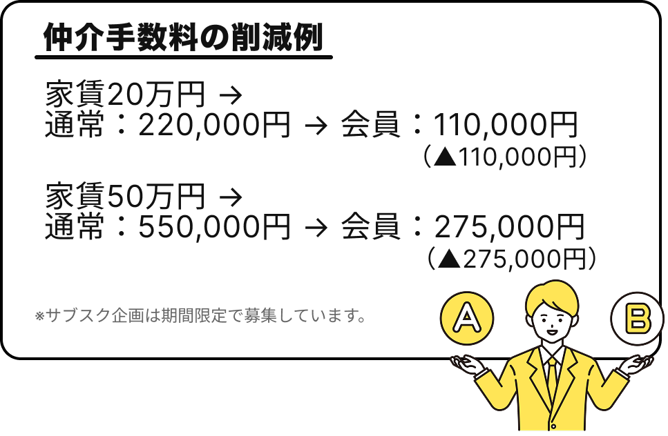 当社経由で契約が成立した場合、仲介手数料は毎回50%OFFになります。